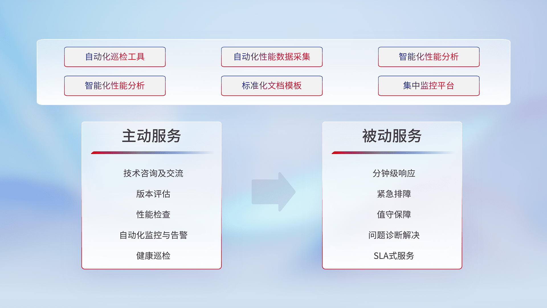 智能化工具和标准化文档,,,,保障服务质量,,,,提供主动服务(包含技术咨询、、、、版本评估、、性能检查、、自动化监控与告警、、、、健康巡检)和被动服务包含(分钟级响应、、、紧急排障、、、、值守保障、、、问题诊断解决、、、、SLA服务)。。。。